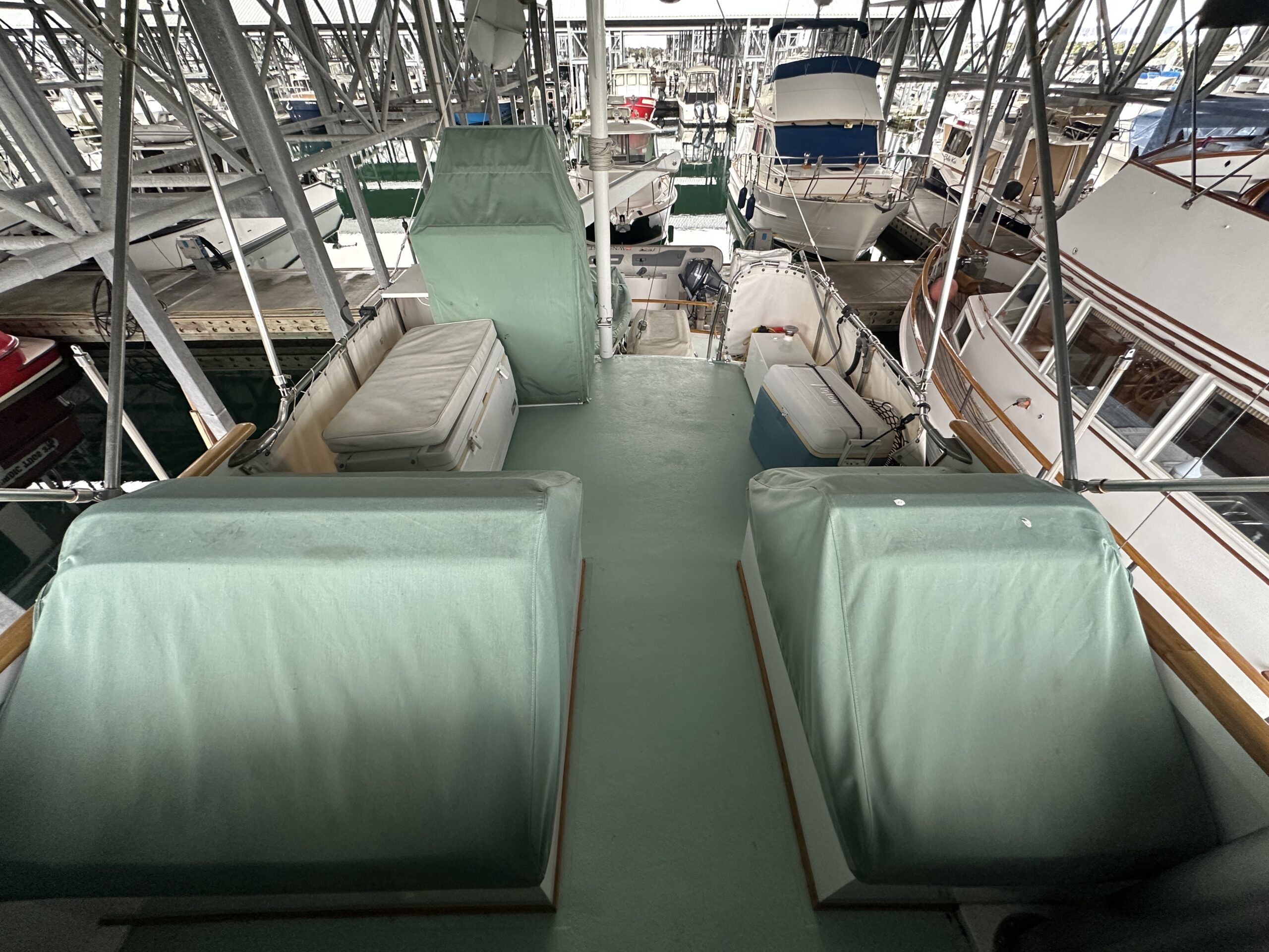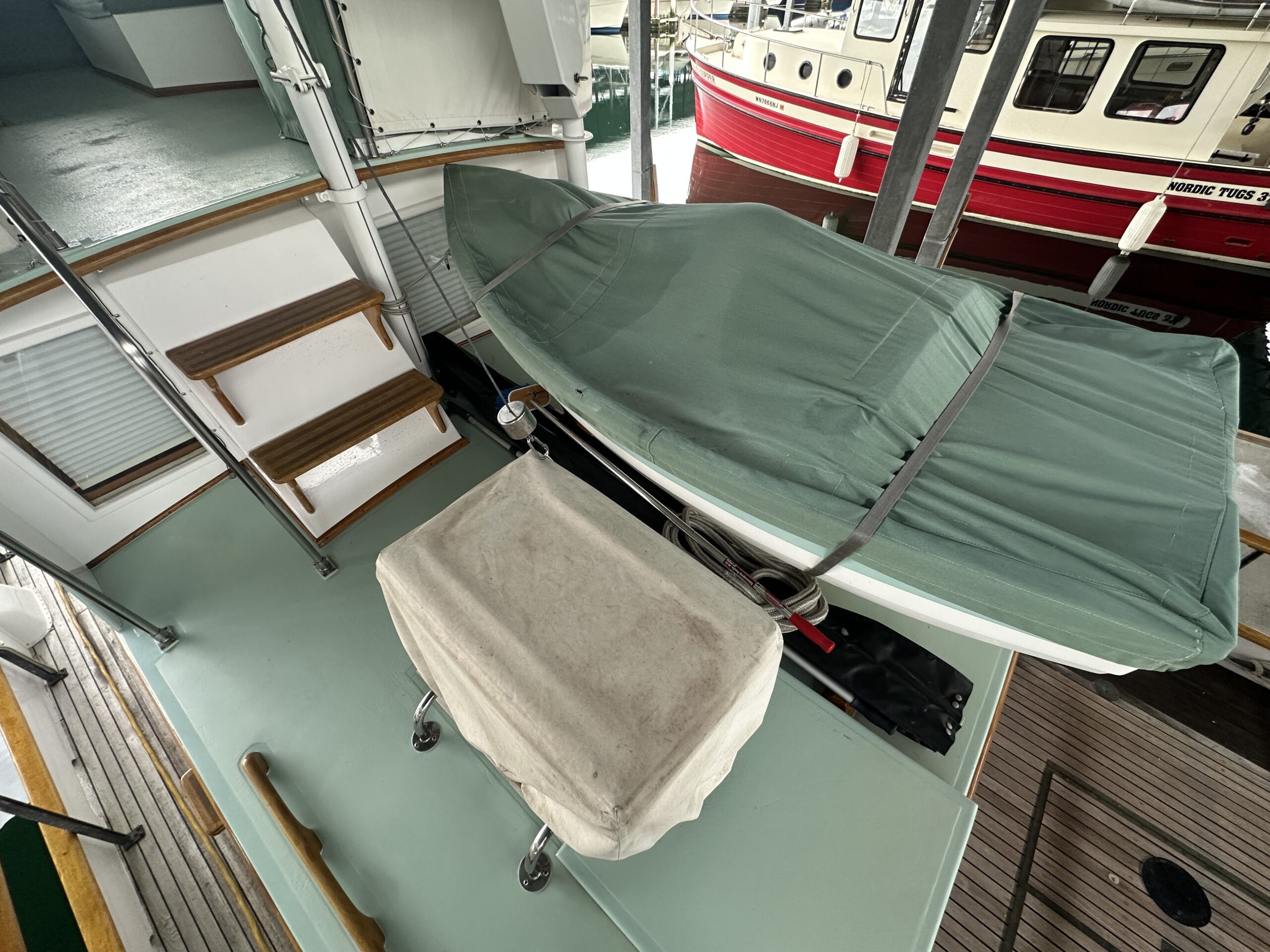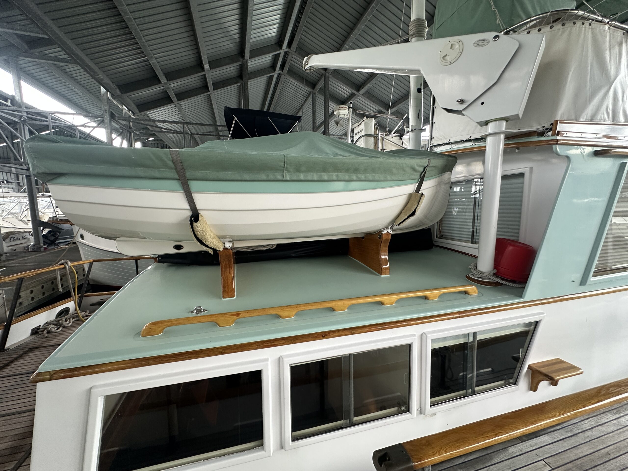 flybridge comprise roughly the middle 1/3 of the deck. Extending from the rear of the pilothouse is a trunk cabin with boat deck atop. Access to the machinery space is beneath the pilothouse sole. The lazarette is accessed via hatches in the stern deck. The topsides are white. The superstructure is white and aqua. Rails are bright. Decks are unfinished teak. The transom is varnished. The boot-stripe is red and bottom paint is red antifouling.